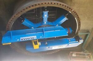 Flange facing at Gianelli Pumping-Generating plant near Los Banos, CA., USA. 13′ Diameter flange was brought back to spec after over 50 years of service with the CLIMAX CM6200 Circular Mill. Rex Nichols |