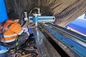 Machined faces on a haul shaft tower mainframe after fabrication. The adaptability of the CLIMAX LM6000 Liner/Gantry Mill made machining on both vertical and horizontal planes achievable. Josh Thomas |