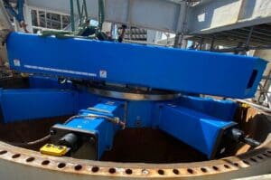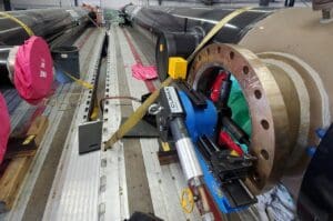 Machining 36-inch (914.4 mm) bronze flanges, on a new feedwater heater, before installation at an east coast nuclear power station. Flanges were out of the flatness tolerance provided by the utility engineers. United Services Group was called and successfully machined (4) 36-inch flanges, using a CLIMAX FF5300 flange Facer, back within tolerance within the given timeline by the utility. Scott Gillman |